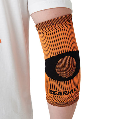 The unique composition and intricate weaving techniques used in the production of the elbow support help apply a comfortable yet critical level of compression. The yarn also has a cross section filled with micro gaps which allows the fabric to breath and eliminate sweat build up during exercise use like running, all while continuing to provide you support while being worn.