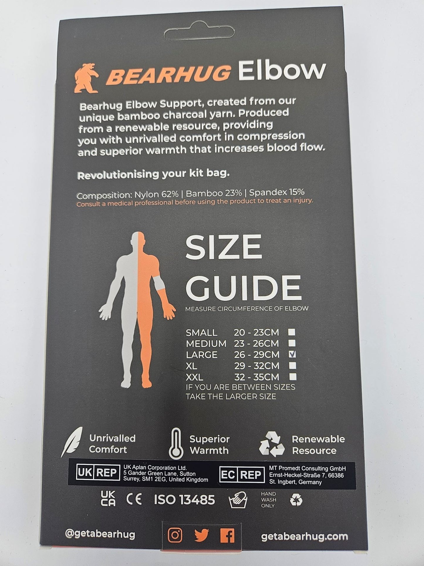 The comfort of the support around the elbow joint is provided by the round structure of the bamboo fibres which are non-irritating and don't crease when worn. The product helps to support and protect the joint and surrounding soft tissue during activity and exercise.